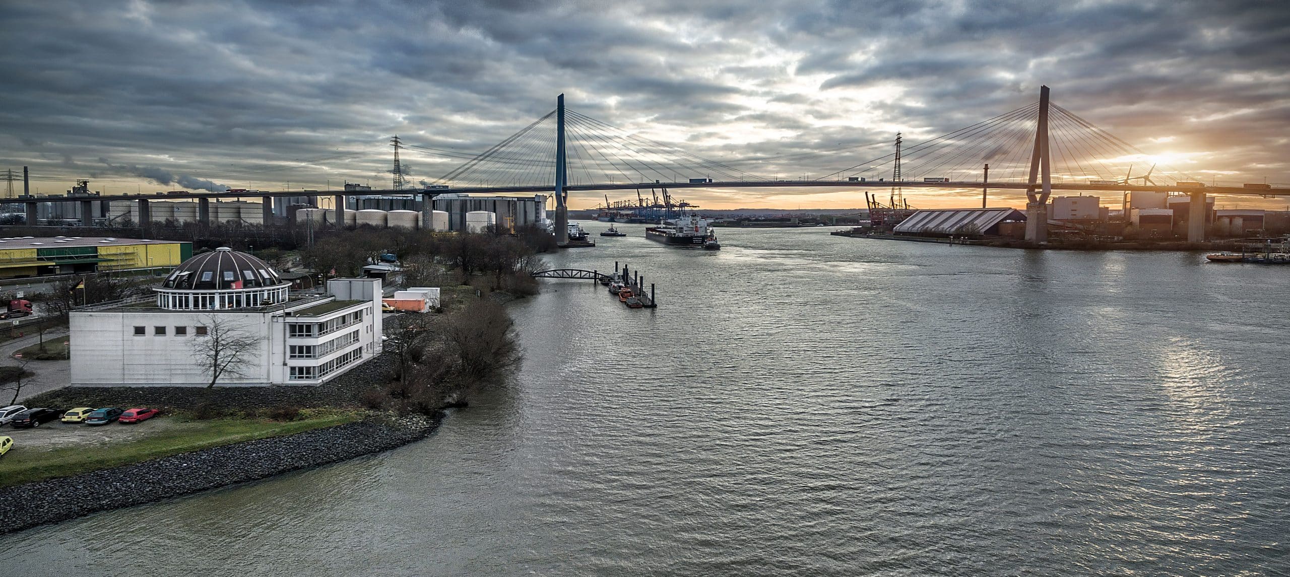 In the headquarters of our company the administration, the shipyard and the maintenance are located. Built in 2005 by Hans Oestmann, the square building with a raised dome is perfectly located between the four large container terminals, the Hansaport and the ADM Ölmühle below the Köhlbrandbrücke and features with a own slip facility.